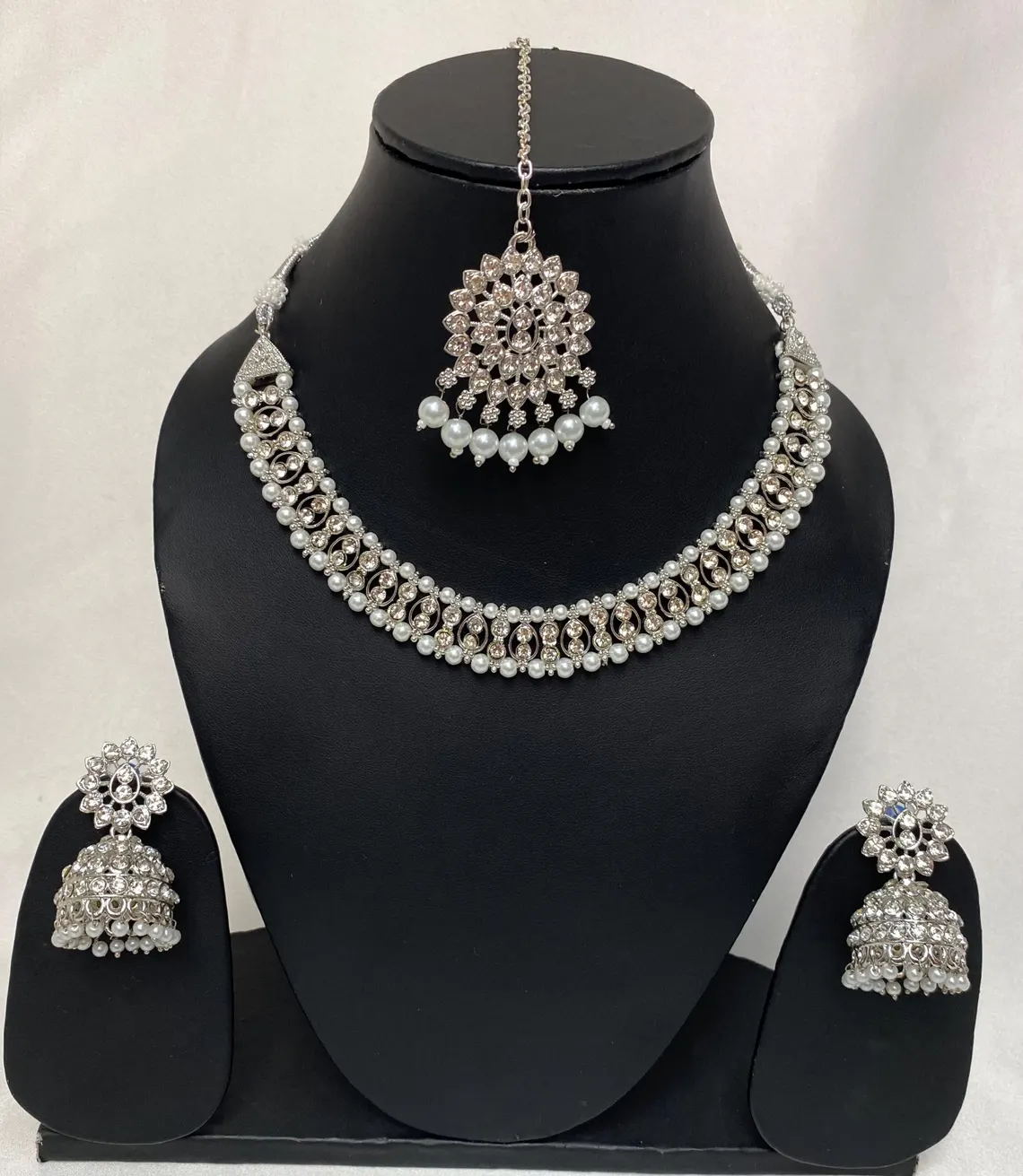 Asian Necklace set earrings tikka, Indian bridal SILVER colour with zhumki 2pcs