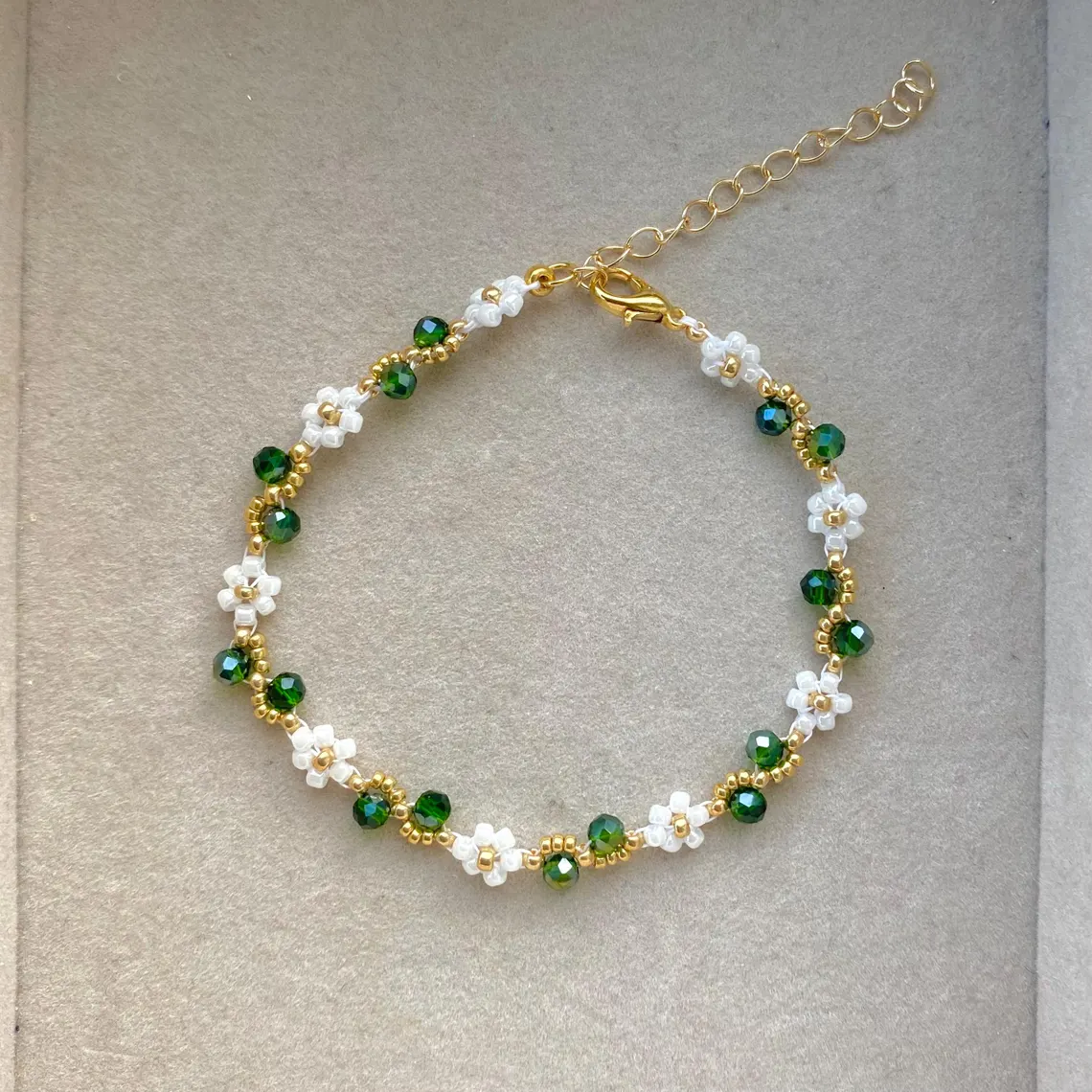 Our Beaded Flower Bracelet is handmade using gold , colour coloured seed beads and 3mm rondelle crystal beads