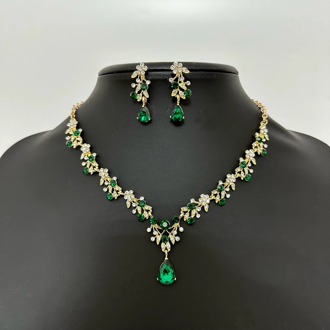 Emerald Green Crystal Jewelry Set, Gold Bridal Necklace Earrings Set